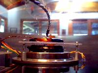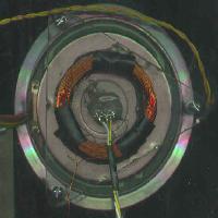 Here is an actual photograph of the backside of the motor assembly. You can clearly see the standoffs and the acrylic stand for the coils and stuff, what you can also see in this picture is the secondary coil which is 200 turns of 28 gauge copper wire, its the black thing wrapped in electrical tape. Sticking our from the center of the secondary is the IR sensor which is used for changing the mode. The other sensor that is only sensitive to visible light was also mounted as close to the center of the spindle as possible with hot glue. Also the primary coil is located above it, i only wrapped it in electrical tape in 3 spots because i thought this would improve cooling. It only gets slightly warm though so this probably wasn't needed.